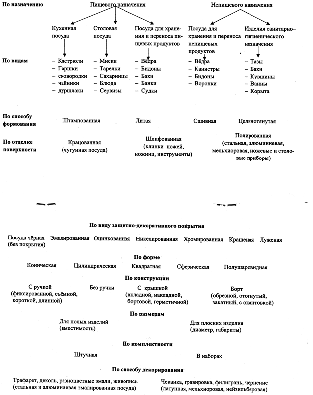 Различают посуду из стали нержавеющей и углеродистой. Посуда из нержавеющей стали обладает высокой устойчивостью к коррозии, растворам поваренной соли и пищевых кислот, она гигиенична, не передаёт пище вкуса и запаха металла, не разрушает витаминов, легко очищается, имеет хороший внешний вид. Посуда из углеродистой стали - её производят из тонколистовой стали кровельной или отожженной: вёдра, баки, детские ванны, посуда. Чёрная стальная посуда дешёвая, но легко подвергается коррозии и выходит из строя: бидоны и воронки для керосина, противни, сковороды, формы для выпечки хлеба. Крашеная стальная посуда покрывается масляными и эмалевыми красками, которые защищают определённое время изделия от коррозии и улучшают их внешний вид: вёдра цилиндрические, бидоны и воронки для керосина, канистры, лейки садовые и другие изделия, предназначенные для непищевых материалов. Оцинкованная стальная посуда изготавливается из оцинкованной листовой стали с последующим горячим оцинкованием изделий. Цинковое покрытие хорошо защищает сталь от коррозии, но под действием воды и газов, содержащихся в воздухе, покрывается плёнкой окиси, гидроокиси цинка или углекислого цинка и тускнеет. Эта плёнка растворяется в пищевых кислотах, щелочах и даже кипящей воде, образуя токсичные соединения, способные вызвать пищевые отравления. Следовательно, она не должна использоваться для приготовления пищи и кипячения питьевой воды. в ассортимент оцинкованной посуды входят ведра, лейки садовые, бидоны для керосина, воронки, баки для воды, баки для белья, корыта, ванны детские, тазы. Лужёная стальная посуда изготавливается из листовой стали с последующим лужением или из белой жести. Посуда из лужёной стали предназначена для хранения молока и молочных продуктов: фляги, ушаты, вёдра, подойники, бидоны, молокомеры сварные. Из белой жести выпускают разные мелкие изделия хозяйственного назначения: цедилки, кружки, воронки, ковши, бидоны для керосина. Эмалированная стальная посуда отличается гигиеничностью, красивым внешним видом, не изменяет вкусовых качеств, приготовленной в ней пищи, сравнительно лёгкая и недорогая. Ассортимент эмалированной посуды включает изделия, применяемые для приготовления и хранения пищи, приёма пищи и различных кухонных надобностей: кастрюли, картофелеварки, молоковарки, судки, чайники, кофейники, кружки, кувшины, миски, вёдра, тазы, ванны детские эмалированные.