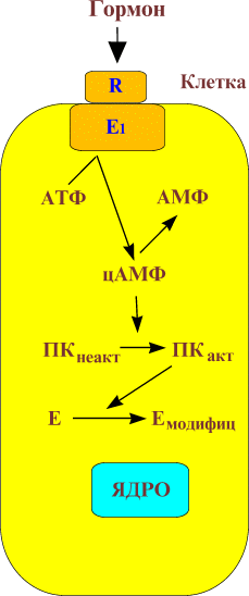 2. Передача сигнала внутри клетки. В любом случае запускается следующая цепочка процессов (в простейшем варианте регуляции). а) За счет изменения активности мембранной АЦ в клетке меняется концентрация цАМФ, который выступает в роли внутриклеточного "медиатора", т.е. посредника между плазмолеммой и внутриклеточными ферментами. б) Соответственно, меняется активность зависимого от посредника регуляторного фермента.Обычно это специфическая протеинкиназа, ПК, для деятельности которой необходим цАМФ. в) В свою очередь, активная ПК фосфорилирует определённый белок(Е). Поэтому степень фосфорилирования данного белка возрастает или уменьшается (последнее - благодаря действию протеинфосфатаз). А вместе с тем меняется и активность этого (регулируемого) белка, в чём и состоял смысл воздействия гормона на клетку. | |