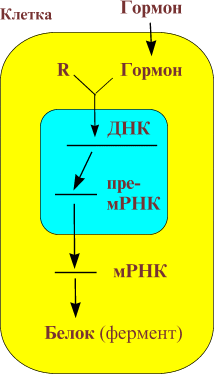 в)Комплекс гормон-рецептор проникает в клеточное ядро. Здесь этот комплексвлияет на сродство регуляторных белков к определённым участкам ДНК. В итоге, меняется скорость синтеза тех или иных ферментных и структурных белков. |