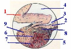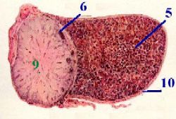 1. Топография и масса. а) Гипофиз связан с серым бугром (1) и воронкой мозга (2). б) В последней находится полость (3) воронки мозга - продолжение полости третьего желудочка (4). в) Нижнюю (суженную) часть воронки иногда называют гипофизарной ножкой. в) Масса самого гипофиза - очень мала: около 0,5 г. Тем не менее его функционирование жизненно необходимо для организма. 2. Составные части гипофиза. а) Гипофиз подразделяется на 2 части: аденогипофиз, который происходит из эпителия ротовой ямки зародыша, и нейрогипофиз, представляющий собой вырост промежуточного (диэнцефального) отдела головного мозга. | Рисунки с препаратов – I. гипофиз кошки, II. гипофиз человека. Окраска эозином. I. Полный размер II. Полный размер |
