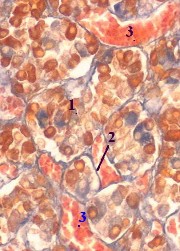 Перечень компонентов. В передней доле имеются три тканевых элемента: секреторные клетки (1) (клетки железистого эпителия), соединительнотканная строма (2) и многочисленные синусоидные (т.е. очень широкие) капилляры (3). Секреторные клетки. а) Секреторные клетки лежат группами, называемыми аденомерами. б) Аденомеры формируют тяжи, складывающиеся в разветвлённую сеть Строма образована прослойками рыхлой соединительной ткани, которые разделяют аденомеры. | 2,б. Препарат – гипофиз человека. Окраска смесью Маллори по Генденгайну. (Среднее увеличение) Полный размер |