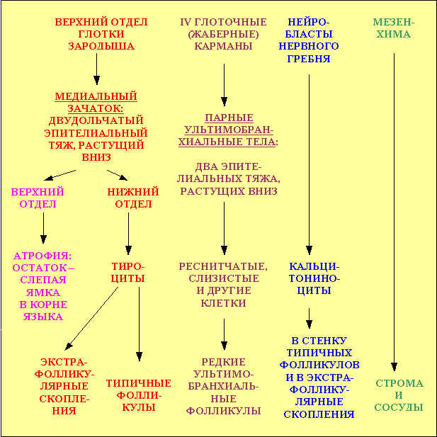 | 1. Основной источник: эпителий верхней части глотки | а) Тироциты происходят из эпителия верхней части глотки, образующего медиальный зачаток – тяж клеток, растущий вниз. б) Затем верхняя часть этого тяжа атрофируется, и от неё остаётся лишь слепая ямка в корне языка. в) Нижняя же часть тяжа разделяется на две доли, а составляющие их клетки дифференцируются в тироциты. г) Последние формируют типичные фолликулы и экстрафолликулярные скопления. |