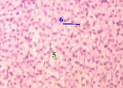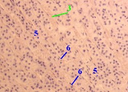 | Пучковая зона | На этих снимках – пучковая зона коры (5). 1. Между пучками эндокриноцитов расположены соединительнотканные прослойки (6) с синусоидными капиллярами (3). 2. а) Сами эндокриноциты в большинстве своём имеют светлую цитоплазму - в связи с высоким содержанием липидных капель с гормонами. б) Встречаются также тёмные клетки: в них липидные капли ещё не успели накопиться. | (Среднее увеличение) в)Полный размер (Большое увеличение) г)Полный размер |
