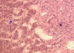 | Сетчатая зона | И, наконец, на последнем снимке – сетчатая зона (7), граничащая с мозговым веществом (8). а) Уже отмечалось, что в этой зоне – самые мелкие в коре эндокриноциты. б) Поэтому в объёме клеток высока доля ядер, что придаёт клеткам относительно тёмный вид. | д)Полный размер |