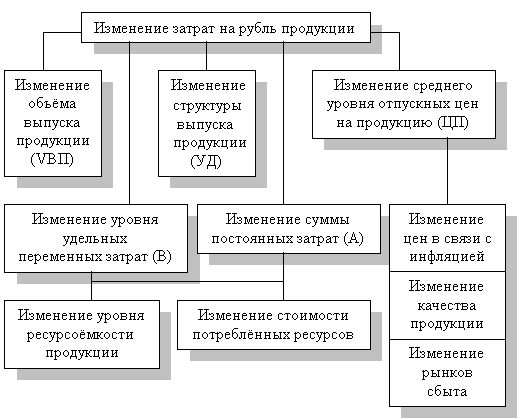 Непосредственное влияние на изменение уровня затрат на 1 руб. товарной продукции оказывают факторы, которые находятся с ним в прямой функциональной связи: изменение объёма выпущенной продукции, её структуры, изменение уровня цен на продукцию, изменение уровня удельных переменных затрат, изменение суммы постоянных затрат.