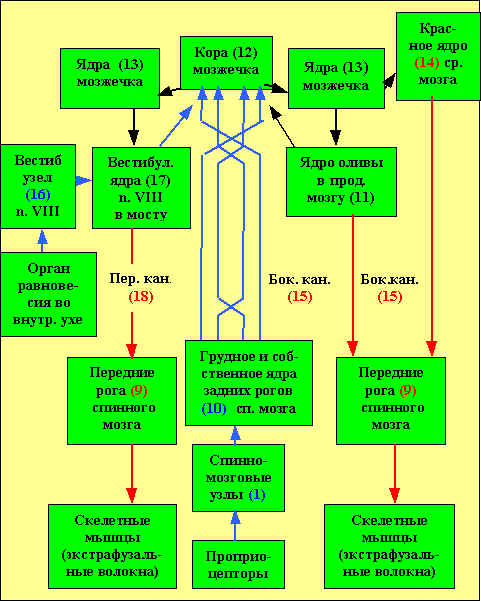 | Более короткие пути | Однако существуют и два более коротких эфферентных пути к мотонейронам спинного мозга: во-первых, от упомянутого на схемах ядра оливы продолговатого мозга (оливо-спинальный путь на границе бокового и переднего канатиков) и, во-вторых, непосредственно от вестибулярных ядер n. VIII (вестибуло-спинальный путь в передних канатиках). |