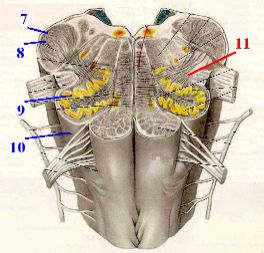 | Локализа- ция | а) Между рубро-спинальным трактом и пирамидами находится ядро оливы (9) – крупное образование в виде извилистой подковы. б) На вентролатеральной (переднебоковой) поверхности продолговатого мозга ему соответствует овальное возвышение – олива (10). | |