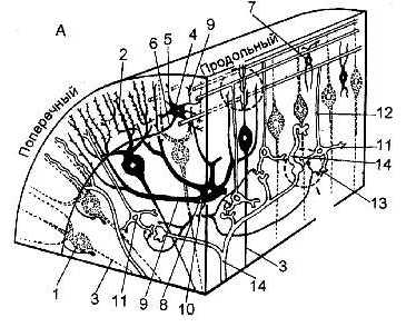 | Схема - кора мозжечка. А. Взаимоотношения нейронов.