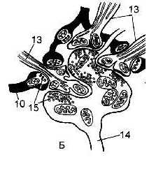 | Схема - кора мозжечка. Б. Клубочек зернистого слоя.