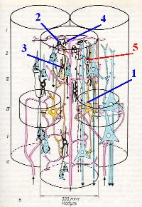 | Схема - межнейрональные связи в коре больших полушарий. 1. Нейроны: а) пирамидные - синие, б) звёздчатые (возбуждающие) - жёлтые, в) тормозные - чёрные. 2. Волокна: а) афферентные - красные, б) эфферентные - синие. |