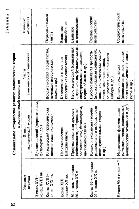 Многие суждения требуют конкретного обоснования. Тем не менее, не претендуя на абсолютную точность, предложенная схема все же в состоянии, на наш взгляд, отразить определенные тенденции в развитии как экономической теории, так и экономической социологии, а также стимулировать наше понимание их взаимоотношений в тот или иной период (см. таблицу 1).