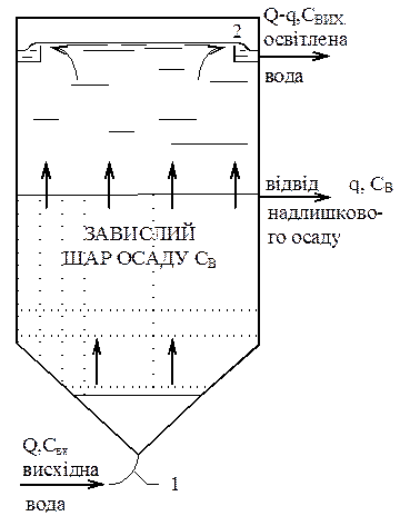 Принцип работы осветлителей заключается в пропускании воды в направлении снизу вверх через слой ранее выделившегося шлама с такой скоростью, при которой ВВ не выносятся из зоны взвешенного осадка (рис.5.9). При этом образуется взвешенный слой осадка (ВСО), который и очищает воду. Чрезмерный осадок отводится с поверхности ВСО непрерывно.
