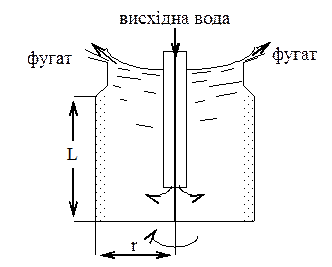 В ЦФ периодического действия (рис.5.12) порция очищаемой воды, поступает в ротор с вертикальной осью вращения, открытый сверху. При вращении ротора частицы примесей отбрасываются к стенкам и накапливаются на них, а очищенная вода (фугато) выбрасывается через горловину и перехватывается кожухом (на схеме не показан). Для выгрузки осадка, накопившийся ротор периодически останавливается и опрокидывается.