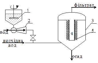 Рис. 5.17. Схема работы намывного фильтра: 1 - бункер с фильтрующим порошком, 2 - гидроэлеватор 3 - намывной фильтр, 4 - патрон, 5- намывной слой.