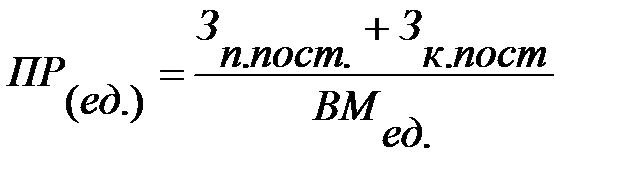 | Порог рентабельности | | Такая выручка от реализации (V продаж), которая покрывает не только переменные и прямые постоянные затраты, но и отнесенную на данный товар величину косвенных постоянных затрат. При этом прибыль от данного товара равна нулю. | 88,89 тыс. шт. 5777,78 тыс. руб. |