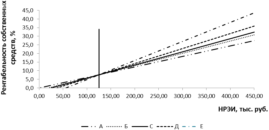 Точка, в которой экономическая рентабельность активов равна средней расчетной ставке процента, называется точкой перелома или критическим (пороговым) значением НРЭИ.