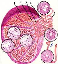 | Семя- выносящие канальцы придатка | Выносящие канальцы яичка (4) | А. Начальные отделы этих канальцев располагаются в яичке (на выходе из средостения) и являются прямыми. Б. Остальные (значительно б о льшие по длине) части канальцев находятся уже в головке придатка яичка, образуя дольки, и являются извитыми. В. Выносящие канальцы впадают в проток придатка. |
