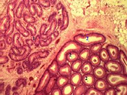 | а) В других местах эпителий образован только невысокими кубическими клетками (2), имеющими не реснички, а микроворсинки -