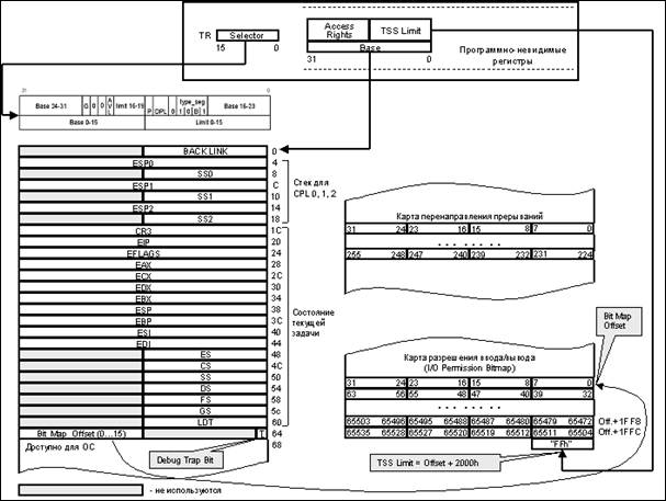 Текущий TSS идентифицируется специальным регистром задачи TR (Task Register). Этот регистр содержит селектор, ссылающийся на дескриптор текущего TSS. Программно-невидимые регистры базового адреса и лимита, связанные TR, загружаются при загрузке в TR нового селектора.