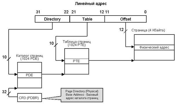 Механизм преобразования включает в себя три этапа: каталог страниц (Page Directory), таблицы страниц (Page Table) и собственно страницы (Page Frame). Механизм страничного преобразования включается установкой бита PG = 1 в регистре CR0. В регистре CR2 хранится линейный адрес отказа (Page Fault Linear Address) – адрес в памяти, по которому был обнаружен последний отказ страницы. В регистре CR3 хранится физический адрес каталога страниц (Page Directory Physical Base Address). Младшие 12 бит этого регистра всегда нулевые, так как каталог всегда выравнивается по границе страницы.