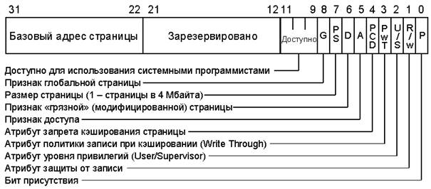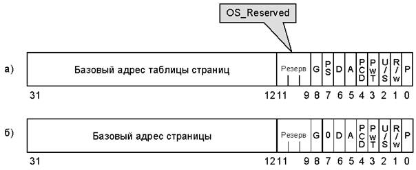 Каталог страниц размером 4 Кбайта содержит 1024 32-битных записи PDE (Page Directory Entry). Структура записи PDE показана на рисунке 1.10а.