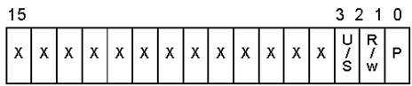 Механизм страничного управления при обращении к памяти может порождать исключение #PF. Оно возникает при обращении к отсутствующей (не представленной) странице или при нарушении прав доступа, определяемых уровнем привилегий и битами U и W. Для идентификации причины отказа в стек помещается 16-битный код ошибки, формат которого приведен на рисунке 1.11. Здесь названия битов совпадают с атрибутами строк, но их назначение другое. Бит U/S указывает, при каком уровне привилегий произошел отказ (1 – уровень пользователя, 0 – супервайзера). Бит W/R указывает, при выполнении какой операции произошел отказ (0 – при чтении, 1 – при записи). Бит Р указывает на причину отказа (Р=1 – отсутствие страницы, Р=0 – нарушение защиты). Биты, помеченные Х, не используются.