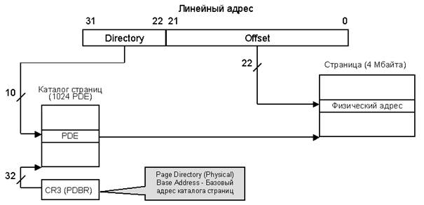 В процессорах, начиная с Pentium, кроме стандартных страниц в 4 Кбайта, могут использоваться страницы размером 4 Мбайта. Увеличение размера страницы связано с общим увеличением физического объема используемой оперативной памяти, и с увеличением накладных расходов на обслуживание маленьких страниц. Для включения расширения размера страницы (PSE – Page Size Extension) необходимо установить бит PSE в управляющем регистре CR4. При CR4.PSE = 0 работает базовый вариант страничного преобразования (рисунок 1.9). При CR4.PSE = 1 процессор анализирует бит 7 (PS, Page Size – размер страницы) строки каталога страниц PDE. Если PDE.PS = 0, эта строка ссылается на таблицу 4-килобайтных страниц, и преобразование выполняется по базовой схеме (рисунок 1.9). Если PDE.PS = 1, то разряды 22 – 31 этой строки представляют базовый физический адрес 4-мегабайтной страницы. (При 4-мегабайтных страницах этап с таблицами страниц исключен.)