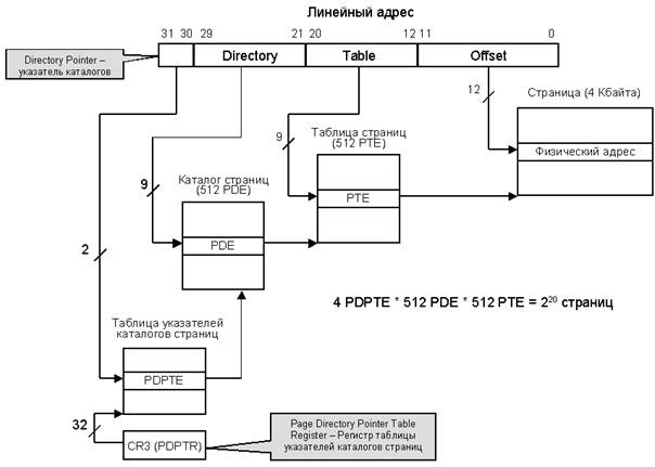 Рисунок 1.15 – Страничное преобразование в режиме расширения физического адреса PAE для страниц размером 4 Кбайта