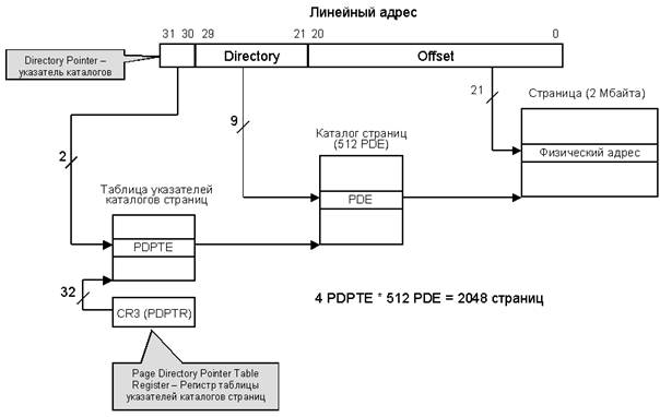 Рисунок 1.16 – Страничное преобразование в режиме расширения физического адреса PAE для страниц размером 2 Мбайта