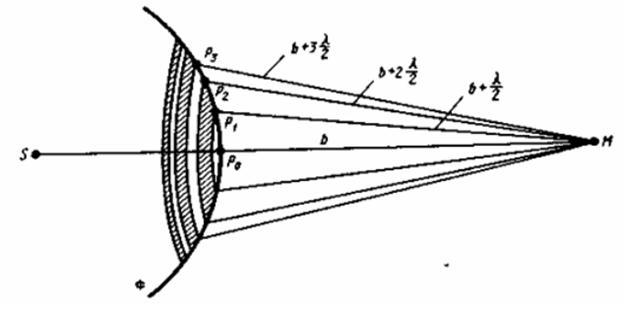 Согласно принципу Гюйгенса - Френеля, заменим действие источника 5 действием воображаемых источников, расположенных на вспомогательной поверхности Ф, являющейся поверхностью фронта волны, идущей из S (поверхность сферы с центром S). Френель разбил волновую поверхность Ф на кольцевые зоны такого размера, чтобы расстояния от краев зоны до М отличались на l/2, т. е. P1M – P0M = P2M – P1M = P3M - P2M=...= l/2. Подобное разбиение фронта волны на зоны можно выполнить, проведя с центром в точке М сферы радиусами