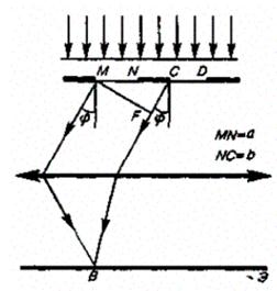 Рассмотрим дифракционную решетку. На вон том рисунке ниже для наглядности показаны только две соседние щели MN и CD. Если ширина каждой щели равна а, а ширина непрозрачных участков между щелями b, то величина d = a + b называется постоянной (периодом) дифракционной решетки.