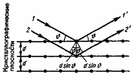 Представим кристаллы в виде совокупности параллельных кристаллографических плоскостей (вон тот рисунок ниже) отстоящих друг от друга на расстоянии d.