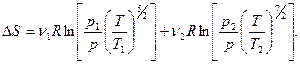 3.8. Вычислить изменение энтропии при смешении одноатомного идеального газа массы m1, имеющего начальную температуру Т1 и давление p1, и двухатомного газа массы m2, имеющего начальные температуру Т2 и давление p2. Молярные массы смешиваемых газов М1 и М2.
