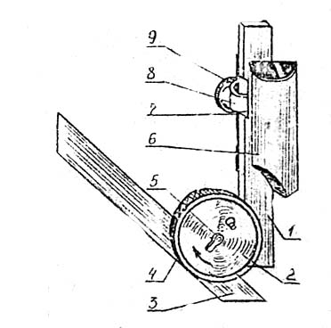 Оптический угломер предназначен для измерения наружных углов от 0 ° до 180 ° и внутренних от 30 ° до 180 °. Цена деления шкалы лимба – 10. Прибор состоит из конуса 2 с отсчетным устройством, двух линеек I и 3, угол между ними устанавливается поворотом по часовой стрелке кольца 4 и фиксирует стопором 5. Подставка 6 закрепляется с помощью вкладыша 7, прижима 8 и гайки 9 и служит для удобной установки прибора на плоскую или цилиндрическую поверхность изделия.