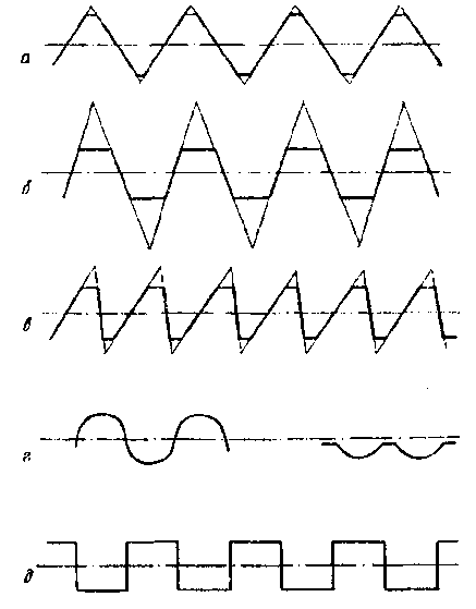 В зависимости от профиля, т.е. от вида фигуры в сечении, резьба бывает треугольной (рис. 5.1, а), трапециедальной (рис. 5.1, б), пилообразной (рис. 5.1, в), круглой (рис. 5.1, г), прямоугольной (рис. 5.1, д).