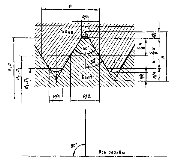Для образования рабочей высоты профиля Н 1 из общей высоты равнобедренного треугольника Н в профиле резьбы предусмотрен срез вершины острых углов у гайки Н/ 4 и у болта Н/ 8. Исходная высота профиля Н установлена в зависимости от шага резьбы и равна 0,8660254 Р, где Р — шаг резьбы.