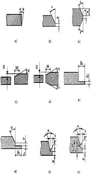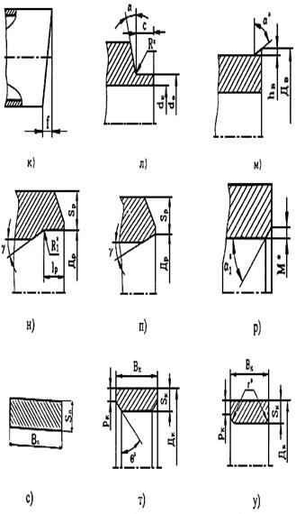 Рисунок 18 – Размеры, контролируемые измерением при подготовке деталей под сварку (Размер измерению не подлежит, обеспечивается режущим инструментом и оценивается визуально): а) I-образная разделка кромки (без скоса кромки); б) V-образная односторонняя разделка кромки; в) V-образная двухсторонняя разделка кромки; г), д) подготовка к сварке стыкового соединения деталей, значительно отличающихся по толщине; е), ж) подготовка к сварке замкового соединения; з) У-образная разделка кромки; и) V-образная двухскосная разделка кромки; к) отклонение от перпендикулярности торца трубы; л) подготовка кромок штуцера Ду 10-65; м) I-образная разделка с присадочным выступом; н) цилиндрическая расточка (раздача) концов труб по внутреннему диаметру; п) коническая расточка труб по внутреннему диаметру; р) притупление внутренней кромки трубы; с) подкладная остающаяся пластина; т), у) подкладное стальное остающееся кольцо.