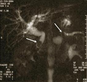 В последние годы широкое распространение приобретает магнитно-резонансная холангиопанкреатография (МРХПГ), обладающая высокой точностью в диагностике причин механической желтухи, особенно в оценке характера и протяженности стриктур желчных путей, а также внутрипротоковых образований. Вместе с тем этот метод лишен пункционно-дренажных лечебных возможностей.