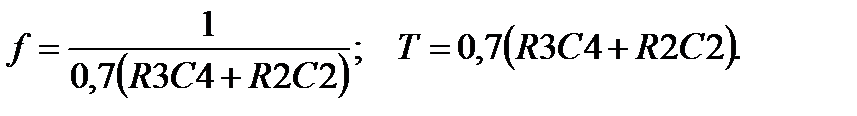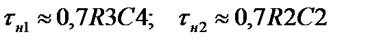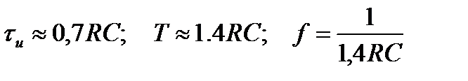 Если номинальные значения времязадающих элементов схемы, попарно одинаковы, т.е. R2=R3=R и С2=С4=С, мультивибратор становится симметричным и генерирует импульсы со скважностью 2. Временные параметры выходного сигнала симметричного мультивибратора определяют по формулам: