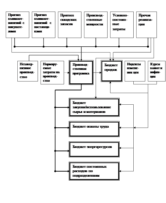 При разработке бюджетов структурных подразделений и служб предприятия необходимо руководствоваться принципом декомпозиции, который заключается в том, что каждый бюджет более низкого уровня является детализацией бюджета более высокого уровня, т.е. бюджеты цехов являются «вложенными» в общий бюджет производства, бюджет производства конкретизирует сводный (комплексный) бюджет.