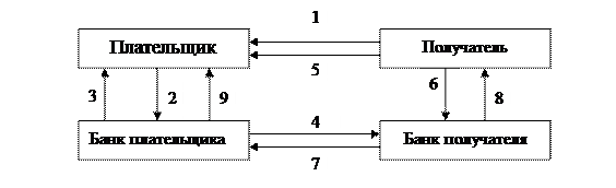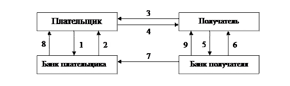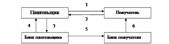 1 - заключение договора, 2 – отгрузка продукции, 3 – передача платежного поручения в банк о списании суммы платежа в пользу поставщика, 4 – уведомление банка о списании денежных средств, 5 – поступление платежного поручения в банк получателя на право зачисления средств на счет получателя, 6 – выписка с расчетного счета о зачислении платежа