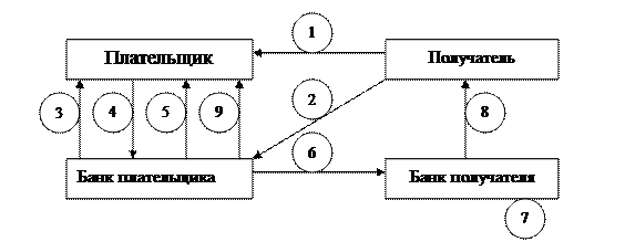 1 – отгрузка товара, услуг, 2 – передача платежного требования банку плательщика вместе с отгрузочными документами, 3 – банк передает плательщику полученные документы для принятия решения об оплате или отказе (акцепт), 4 – возврат акцептованных платежных документов для оплаты, 5 – передача банком отгрузочных документов плательщику, 6 – списание средств с расчетного счета плательщика и отправка документов в банк получателя, 7 – зачисление средств на расчетный счет получателя, 8 – выдача выписки с расчетного счета получателя.