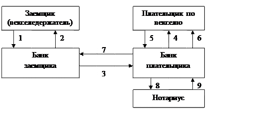 1 – векселедержатель предъявляет вексель в банк для получения ссуды, 2 – банк выдает ссуду, 3 – банк отсылает иногородние векселя на инкассо в банк плательщика, 4 – банк плательщика предъявляет к оплате векселя, по которым наступил срок оплаты, 5 – плательщик дает согласие на оплату, 6 – банк плательщика извещается об оплате векселей, 7 – банк заемщика зачисляет деньги в оплату векселя на свой корреспондентский счет в банке-корреспонденте, 8 – при неоплате векселя плательщиком банк плательщика предъявляет векселя нотариусу для совершения протеста, 9 – нотариус возвращает опротестованные векселя