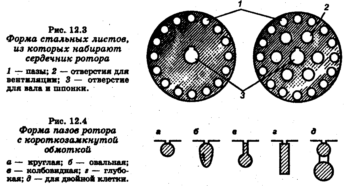 раза. Меньшее значение указанного напряжения является номинальным напряжением, на которое рассчитаны фазные обмотки статора. Способ соединения обмоток зависит от линейного напряжения в трехфазной сети. Если линейное напряжение источника питания равно наибольшему напряжению, указанному в паспорте машины, то обмотку его статора соединяют звездой, в противном случае — треугольником. В некоторых случаях обмотки соединены внутри двигателя и снаружи имеется только три вывода. В этом случае на щитке указано линейное напряжение. Ротор асинхронного двигателя также набирают из стальных штампованных листов (рис. 12.3). Насаженные на вал, они образуют ротор, имеющий форму цилиндра. По наружному периметру листа штампуют отверстия, образующие пазы ротора, в которые закладывают обмотку. Форма пазов может быть различной (рис. 12.4). Двигатели большой мощности имеют ротор с вентиляционными отверстиями для охлаждения.