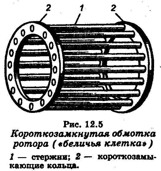 По конструктивному исполнению обмотки ротора асинхронные двигатели подразделяют на двигатели с короткозамкнутым ротором и двигатели с фазным ротором. Короткозамкнутая обмотка образуется медными или латунными неизолированными стержнями, помещаемыми в пазы ротора. Поперечное сечение этих стержней имеет форму паза. По торцам стержни соединяют медными короткозамыкающими кольцами. Получается обмотка, не имеющая никаких выводов (рис. 12.5). Такие обмотки могут быть одноклеточными и двухклеточными (форма паза на рис. 12.4д). Число фаз такой обмотки равно числу пазов, в которых она размещена.