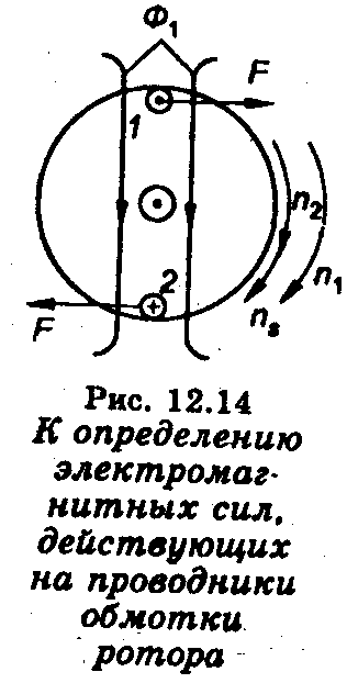 Созданное обмоткой статора вращающееся с частотой п 1магнитное поле (магнитный поток Ф1) пересекает проводники обмотки ротора и индуцирует в них ЭДС (рис, 12.14). Рассмотрим два проводника (1 и 2) обмотки ротора, расположенные диаметрально противоположно на осевой линии магнитного потока. Согласно правилу правой руки ЭДС в проводнике 1 направлена «на читателя», а в проводнике 2 — «от читателя». Проводники обмотки ротора (как короткозамкнутого, так и фазного) образуют замкнутую цепь, и под действием ЭДС в них возникает ток ротора, направление активной составляющей которого совпадает с направлением ЭДС. На проводники ротора с током, расположенные в магнитном поле, действуют силы F, пропорциональные магнитной индукции в месте расположения проводников, активной составляющей тока в них и длине проводников. Направление силы (см. рис. 12.14) определяют по правилу левой руки. Такие же силы действуют на все проводники обмотки ротора, при этом возникает вращающий момент на валу. Если вращающий момент превысит значение тормозного момента на валу, ротор начнет вращаться, и его частота вращения будет возрастать до тех пор, пока не наступит равновесие моментов при некотором значении частоты вращения n2=const.