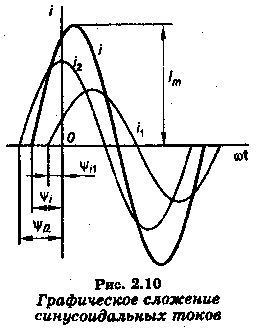При сложении син. величин надо сложить ординаты для ряда значений угла ωt и по точкам построить синусоиду суммарной величины. На рис 2.10 показано сложение двух токой i1 и i2. Суммарный ток