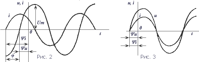 Разница начальных фаз φ = ψi − ψu определяет угол сдвига фаз. На рис. 2 приведены графики синусоидальных величин (тока, напряжения), сдвинутых по фазе. Когда же начальные фазы двух величин равны ψi = ψu, то разница ψi − ψu = 0 и, значит, сдвига фаз нет φ = 0 (рис. 3).