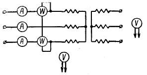 Измерения U1и U20 производятся при помощи вольтметров или при высоком напряжении при помощи вольтметров и измерительных трансформаторов напряжения. По данным измерений находят коэффициент трансформации: U20 / U1 ≈ω2/ω1. По амперметру и ваттметру находят ток I0 и мощность Р0в случае однофазного трансформатора. В случае трехфазного трансформатора необходимо измерить токи во всех трех фазах, так как вследствие несимметрии магнитных цепей отдельных фаз токи в них будут различны. За ток холостого хода здесь принимается среднее арифметическое токов отдельных фаз, т. е.