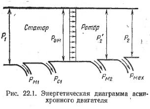 Процесс преобразования энергии и потери, происходящие при работе двигателя, можно иллюстрировать энергетической диаграммой (рис. 22.1). Потребляемая двигателем мощность из сети P1 = m1U1l1 cosφ1 частично расходуется на покрытие потерь в обмотках статора Рm1 =т1I12r1 и в стали сердечника статора Рс1 на гистерезис и вихревые токи. Оставшаяся часть мощности Pэм = P1—Рm1—Рс1, называемая электромагнитной, передается ротору через воздушный зазор вращающимся магнитным полем. Энергия, полученная ротором, преобразуется в механическую и частично расходуется на покрытие потерь в роторе. На диаграмме показано, что электромагнитная мощность, поступающая на ротор, может быть представлена в виде суммы двух мощностей: Рэм=P’2 +Pm2